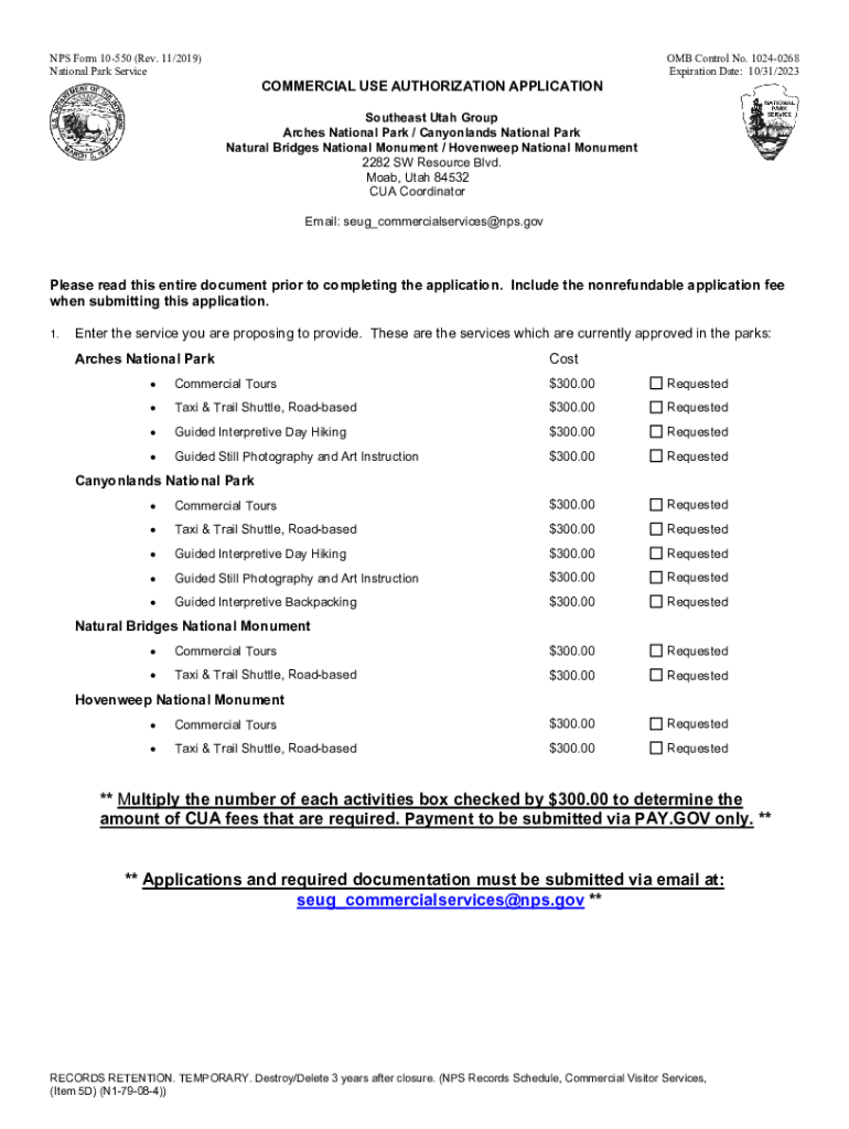 NPS Form 10550 (Rev. 11/2019) National Park ServiceCOMMERCIAL USE AUTHORIZATION APPLICATION OMB Control No. 10240268 Expiration Date: 10/31/2023Southeast Utah Group Arches National Park / Canyon lands