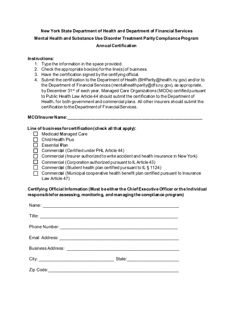 New York State Department of Health and Department of Financial Services Mental Health and Substance Use Disorder Treatment ParityCompliance Program Annual Certification Instructions: 1. Type the