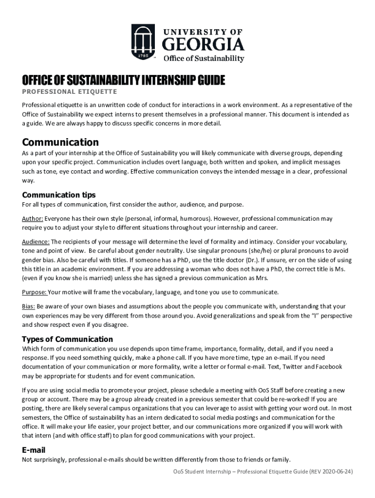OFFICE OF SUSTAINABILITY INTERNSHIP GUIDE PROFESSIONAL ETIQUETTEProfessional etiquette is an unwritten code of conduct for interactions in a work environment. As a representative of the Office of