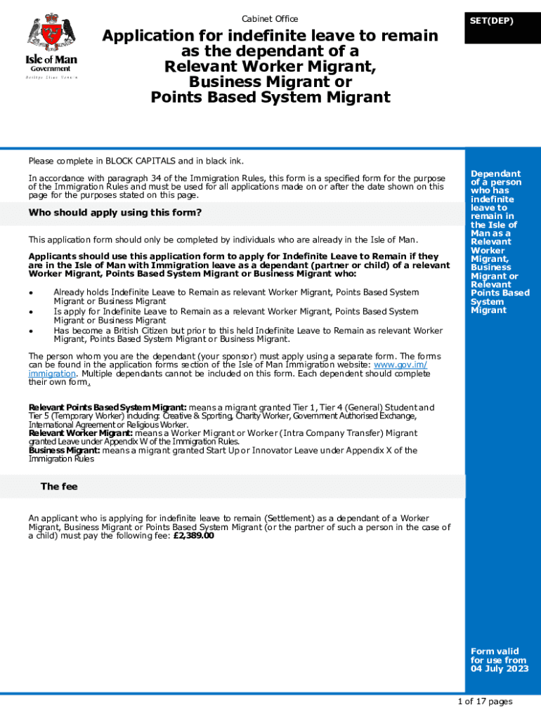 Cabinet OfficeApplication for indefinite leave to remain as the dependent of a Relevant Worker Migrant, Business Migrant or Points Based System Migrant SET(DEP)Please complete in BLOCK CAPITALS and