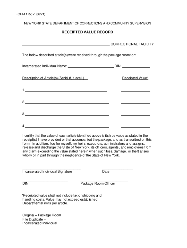 FORM 1755V (06/21) NEW YORK STATE DEPARTMENT OF CORRECTIONS AND COMMUNITY SUPERVISIONRECEIPTED VALUE RECORD CORRECTIONAL FACILITY The below described article(s) were received through the package room