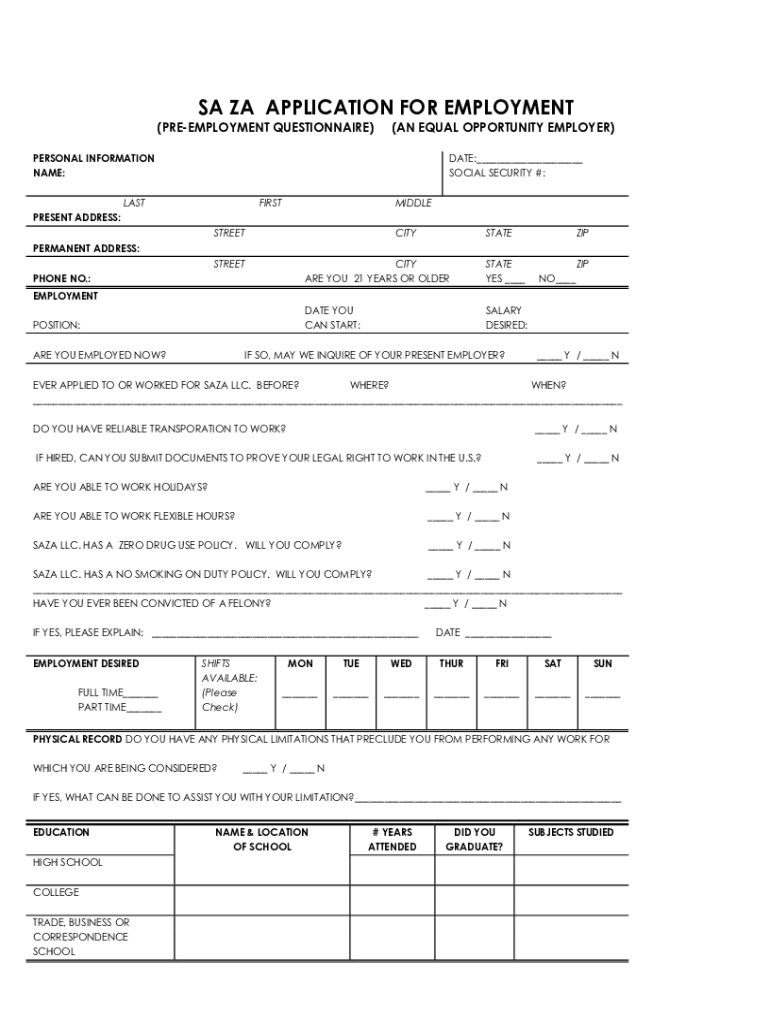 SA ZA APPLICATION FOR EMPLOYMENT(PREEMPLOYMENT QUESTIONNAIRE)(AN EQUAL OPPORTUNITY EMPLOYER)PERSONAL INFORMATION NAME:PRESENT ADDRESS:DATE:___ SOCIAL SECURITY #:LASTFIRSTMIDDLESTREETPERMANENT ADDRESS:CITYSTREETPHONE