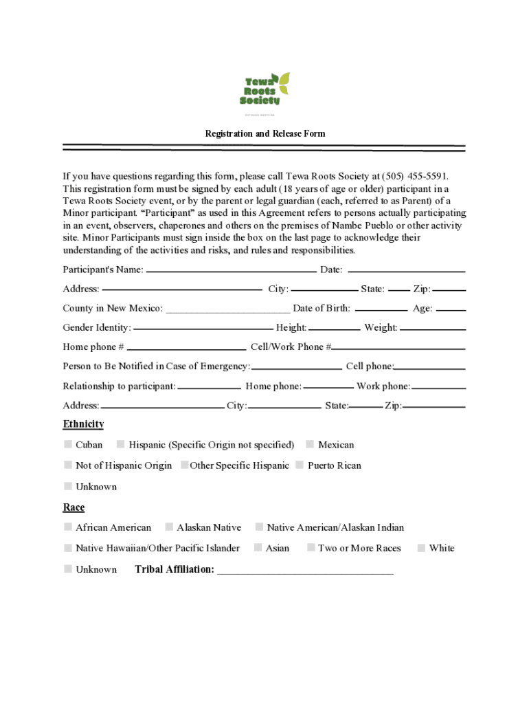 Registration and Release Formic you have questions regarding this form, please call Too Roots Society at (505) 4555591. This registration form must be signed by each adult (18 years of age or older)