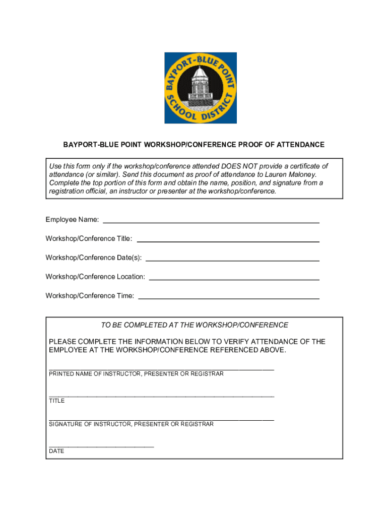 BAYPORTBLUE POINT WORKSHOP/CONFERENCE PROOF OF ATTENDANCE Use this form only if the workshop/conference attended DOES NOT provide a certificate of attendance (or similar). Send this document as proof
