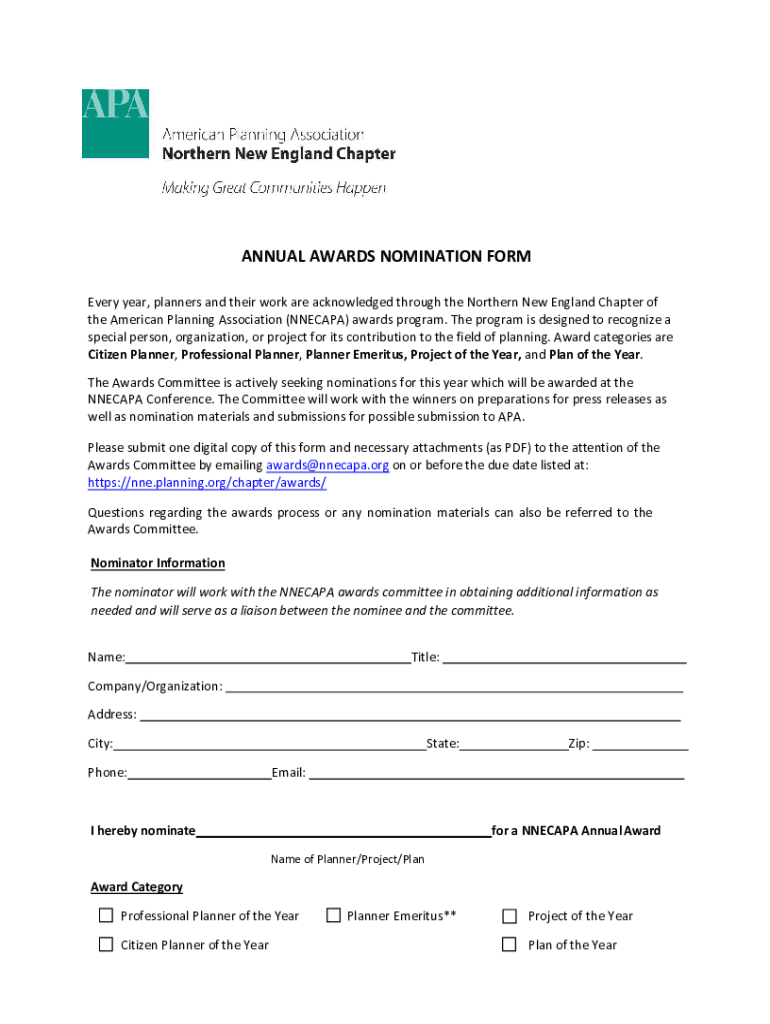 The nnecapa awards nomination form is a document used to nominate individuals or organizations for recognition in the field of planning.