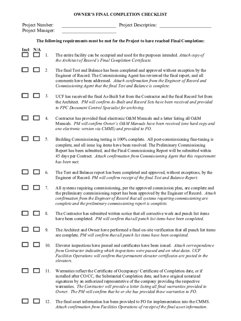 OWNERS FINAL COMPLETION CHECKLISTProject Number: