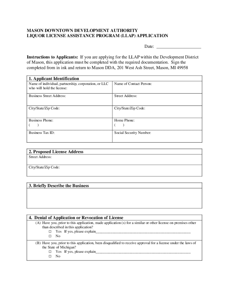 MASON DOWNTOWN DEVELOPMENT AUTHORITY LIQUOR LICENSE ASSISTANCE PROGRAM (LAP) APPLICATION Date: ___ Instructions to Applicants: If you are applying for the LAP within the Development District of Mason,