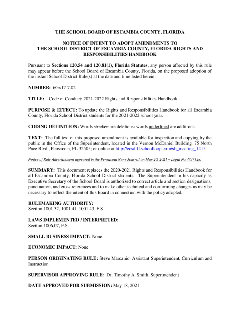THE SCHOOL BOARD OF ESCAMBIA COUNTY, FLORIDA NOTICE OF INTENT TO ADOPT AMENDMENTS TO THE SCHOOL DISTRICT OF ESCAMBIA COUNTY, FLORIDA RIGHTS AND RESPONSIBILITIES HANDBOOK Pursuant to Sections 120.54