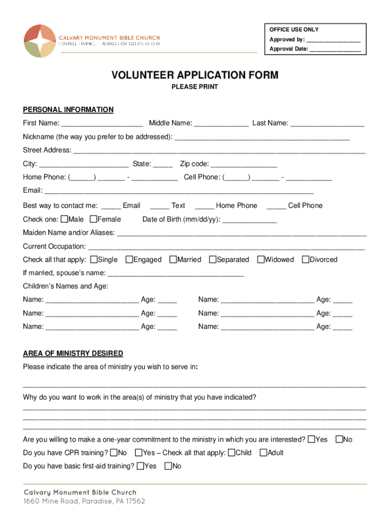 OFFICE USE ONLY Approved by: ___ Approval Date: ___VOLUNTEER APPLICATION FORM PLEASE PRINTPERSONAL INFORMATION First Name: ___ Middle Name: ___ Last Name: ___ Nickname (the way you prefer to be addressed):