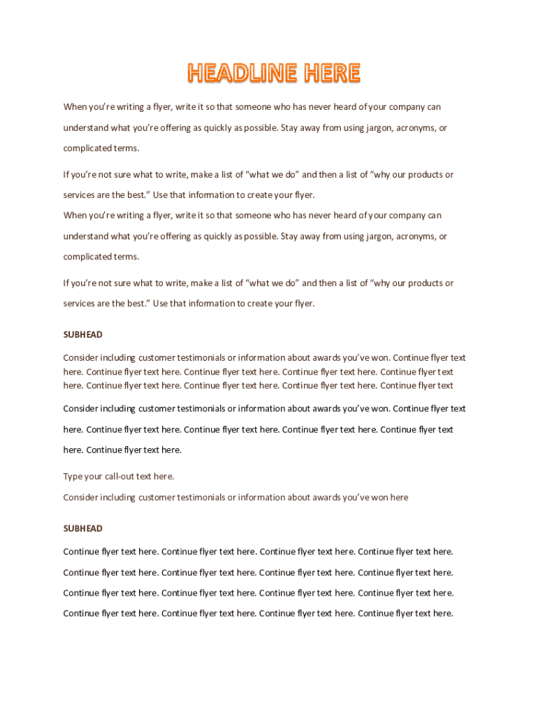 When you're writing a flyer, write it so that someone who has never heard of your company can understand what you're offering as quickly as possible. Stay away from using jargon, acronyms, or complicated