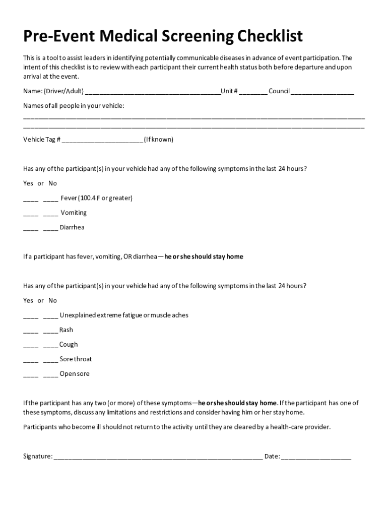 Prevent Medical Screening Checklist This is a tool to assist leaders in identifying potentially communicable diseases in advance of event participation. The intent of this checklist is to review with