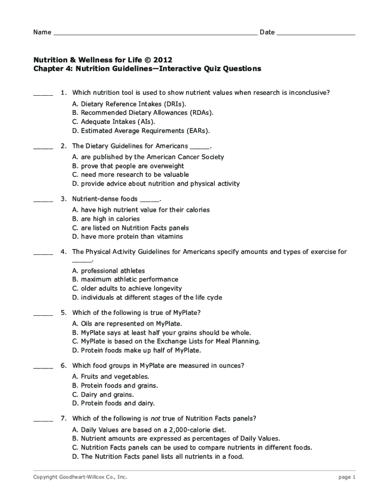 NameDateNutrition & Wellness for Life 2012 Chapter 4: Nutrition GuidelinesInteractive Quiz Questions1. Which nutrition tool is used to show nutrient values when research is inconclusive? A. Dietary