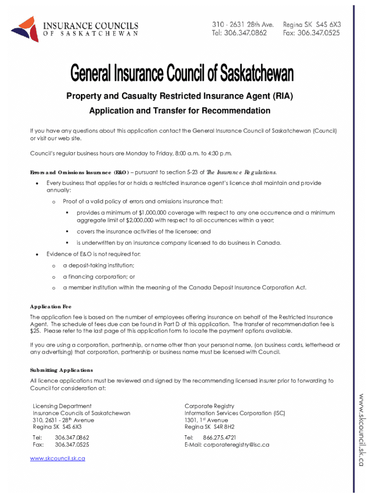 Property and Casualty Restricted Insurance Agent (RIA) Application and Transfer for Recommendation If you have any questions about this application contact the General Insurance Council of Saskatchewan