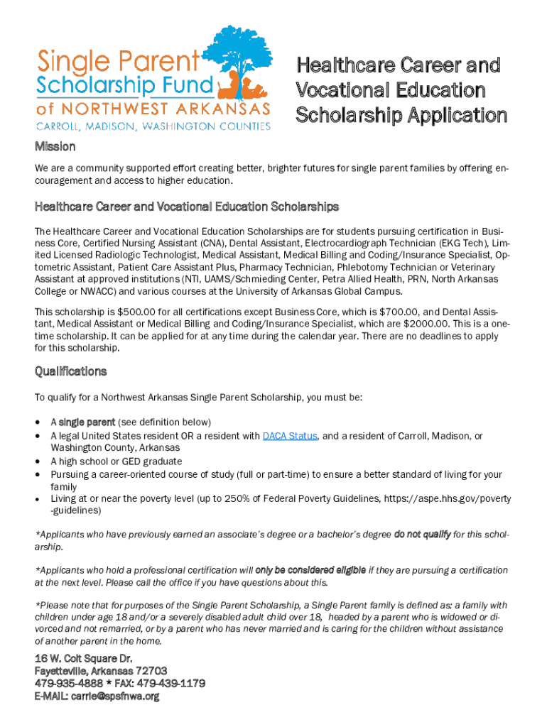 Healthcare Career and Vocational Education Scholarship Application Mission We are a community supported effort creating better, brighter futures for single parent families by offering encouragement