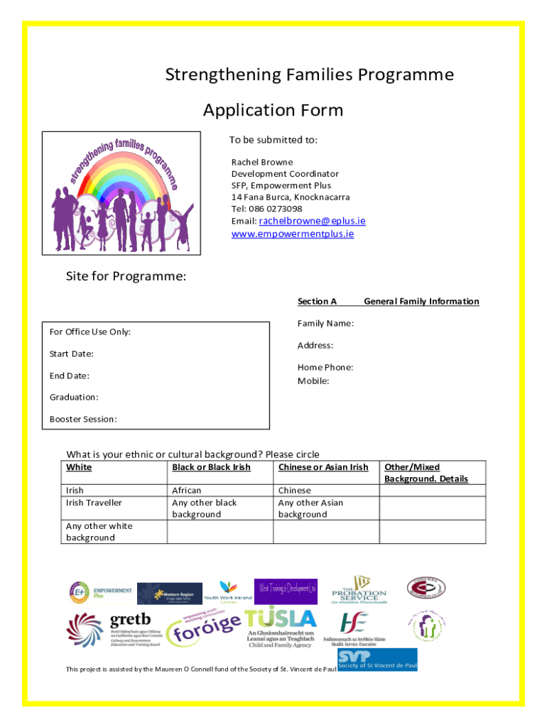 Strengthening Families Program Application Form To be submitted to: Rachel Browne Development Coordinator SFP, Empowerment Plus 14 Fans Burma, Knocknacarra Tel: 086 0273098 Email: rachelbrowne@eplus.iewww.empowermentplus.ieSite
