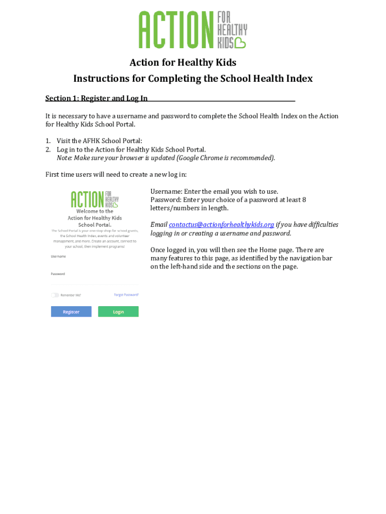 Action for Healthy Kids Instructions for Completing the School Health Index Section 1: Register and Log In It is necessary to have a username and password to complete the School Health Index on the