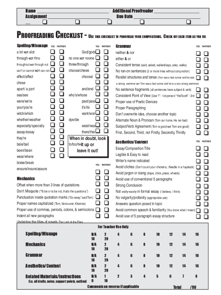Name ___ Additional Proofreader ___ Assignment ___ Due Date ___ __PROOFREADING CHECKLIST USE THIS CHECKLIST TO PROOFREAD YOUR COMPOSITIONS. Spelling/Misusage a lot NOT a lot through NOT thou PARTNER