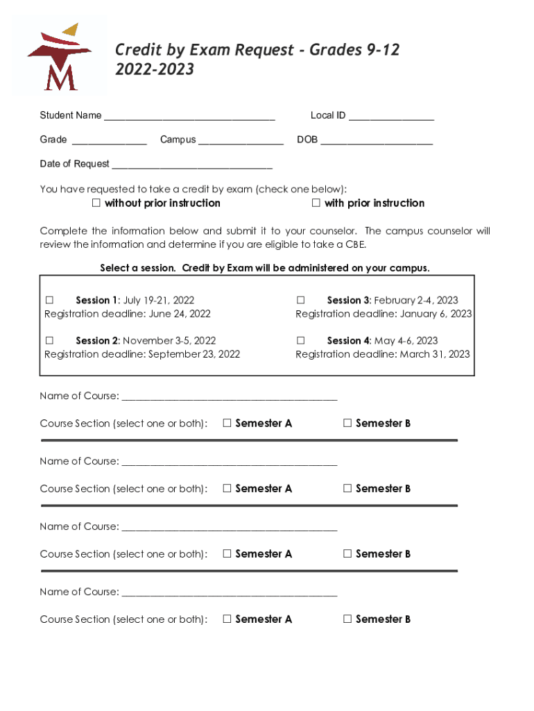 Credit by Exam Request Grades 912 20222023 Student Name ___ Grade ___Campus ___Local ID ___ DOB ___Date of Request ___ You have requested to take a credit by exam (check one below): without prior