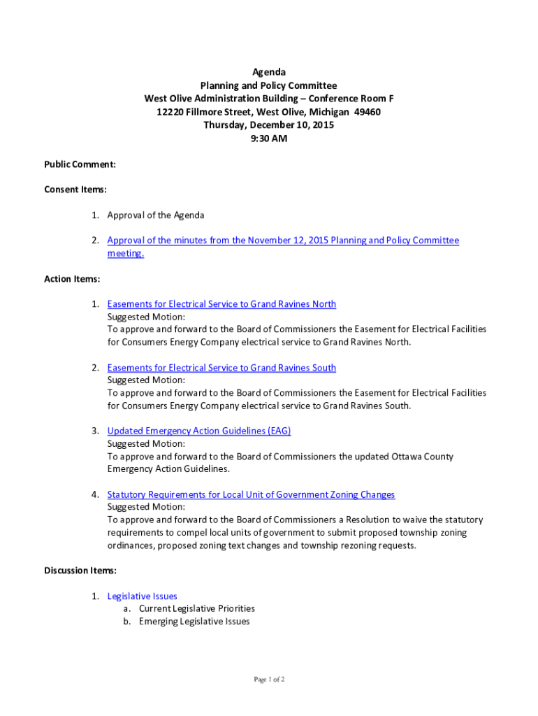 Agenda Planning and Policy Committee West Olive Administration Building Conference Room F 12220 Fillmore Street, West Olive, Michigan 49460 Thursday, December 10, 2015 9:30 AM Public Comment: Consent