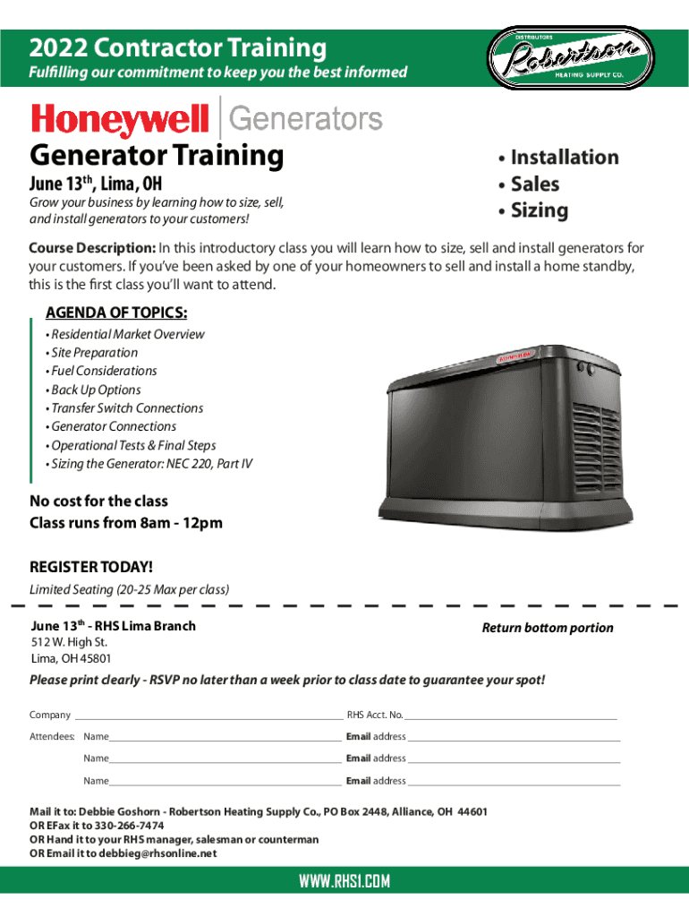 2022 Contractor TrainingFulfilling our commitment to keep you the best informedGenerator Training Installation Sales Sizing June 13th, Lima, Grow your business by learning how to size, sell, and install