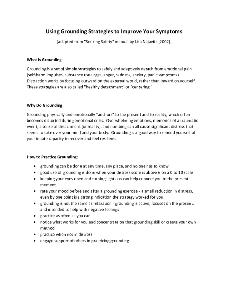 Using Grounding Strategies to Improve Your Symptoms (adapted from \” Seeking Safety\” manual by Lisa Navies (2002). What is Grounding: Grounding is a set of simple strategies to safely and adaptive