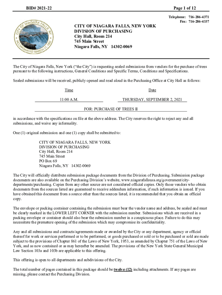 BID# 202122Page 1 of 12 Telephone: 7162864371 Fax: 7162864337CITY OF NIAGARA FALLS, NEW YORK DIVISION OF PURCHASING City Hall, Room 214 745 Main Street Niagara Falls, NY 143020069The City of Niagara
