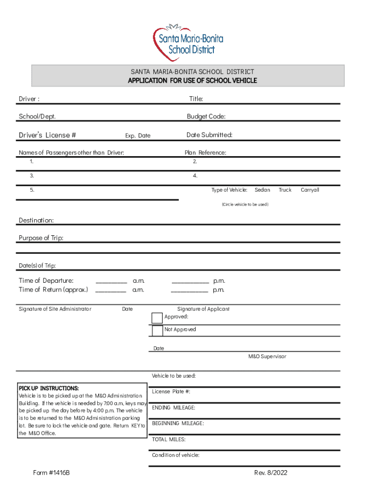 SANTA MARIABONITA SCHOOL DISTRICT APPLICATION FOR USE OF SCHOOL VEHICLE Driver :Title:School/Dept. Budget Code:Driver's License #Date Submitted:Exp. Databases of Passengers other than Driver:Plan