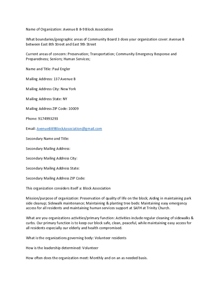 Get the free Name of Organization: Avenue B 8-9 Block Association