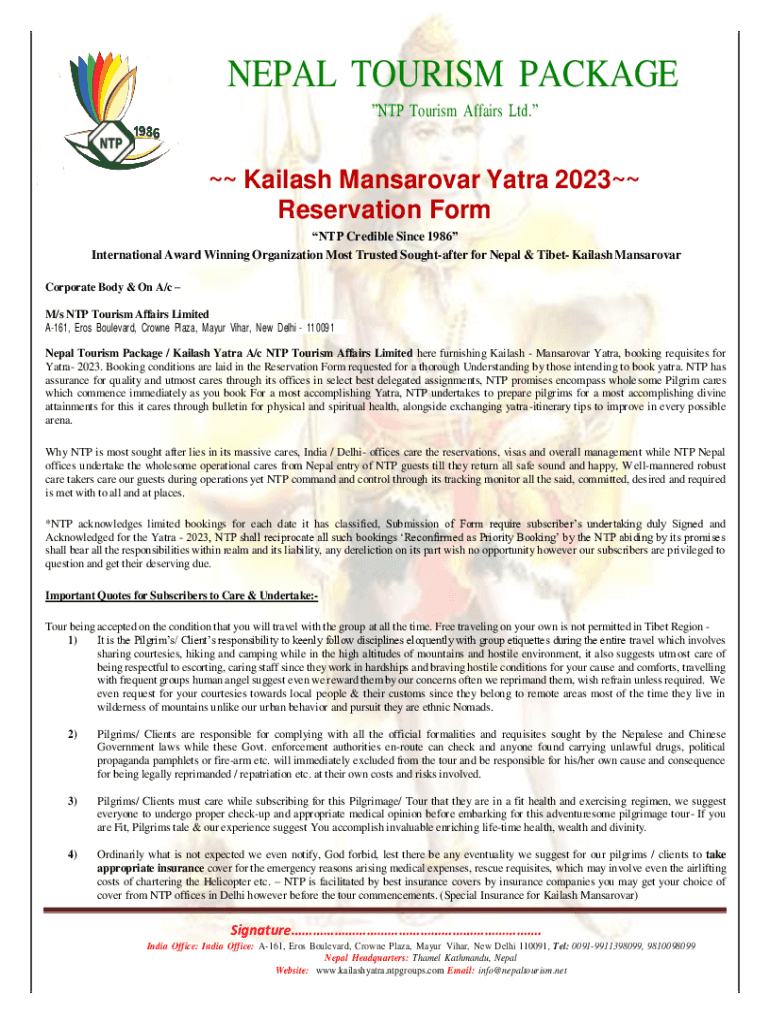 NEPAL TOURISM PACKAGE NTP Tourism Affairs Ltd. Baileys Mansarovar Tatra 2023 Reservation Form NTP Credible Since 1986 International Award Winning Organization Most Trusted Sought after for Nepal &
