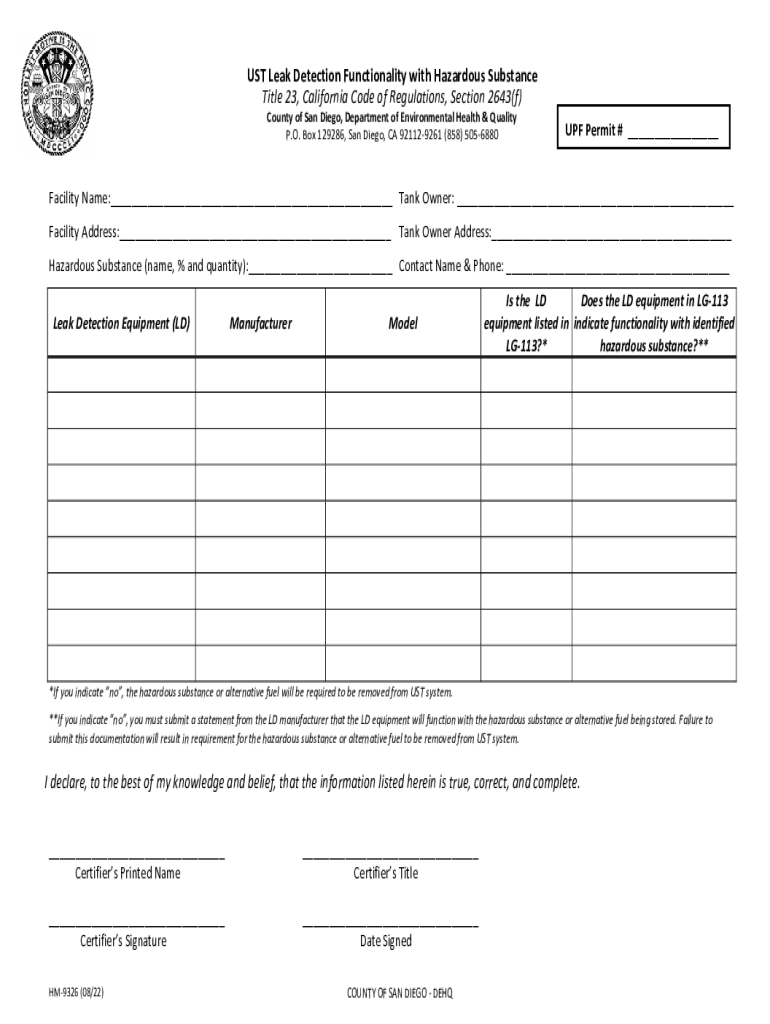 USTLeakDetectionFunctionalitywithHazardousSubstance Title23,CaliforniaCodeofRegulations,Section2643(f) CountyofSanDiego, DepartmentofEnvironmentalHealth & Quality P.O. Box129286,San Diego,CA921129261(858)5056880UPFPermit#___Facilitate:___