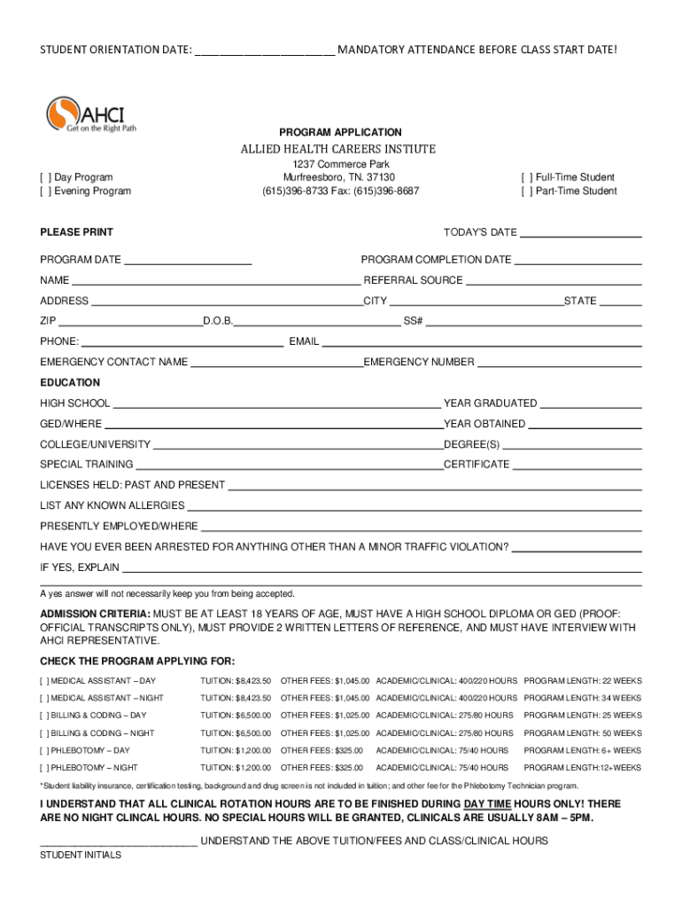 STUDENT ORIENTATION DATE: ___ MANDATORY ATTENDANCE BEFORE CLASS START DATE!PROGRAM APPLICATIONALLIED HEALTH CAREERS INSTITUTE