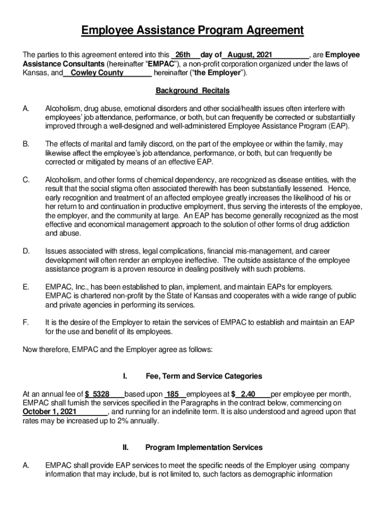 Employee Assistance Program Agreement The parties to this agreement entered into this _26th__ day of _August 2021___, are Employee Assistance Consultants (hereinafter EMAC), a nonprofit corporation