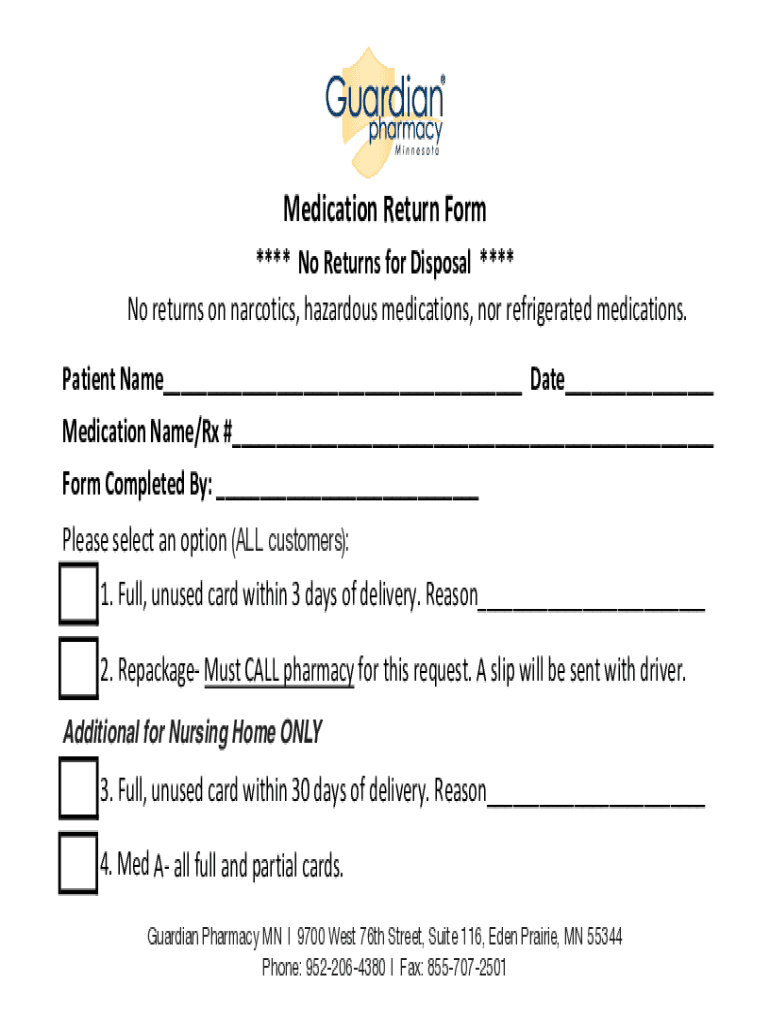 Medication Return Former No Returns for Disposal ******** No Returns for Disposal ******** No returns on narcotics, hazardous medications, nor refrigerated medications. No returns on narcotics, hazardous