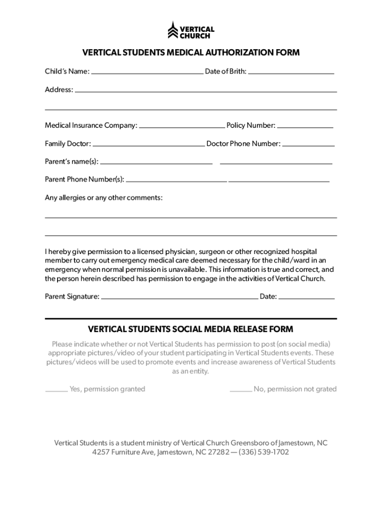 Vertical students medical authorization can be filled out by providing the student's medical information, emergency contacts, and any specific medical treatment instructions.