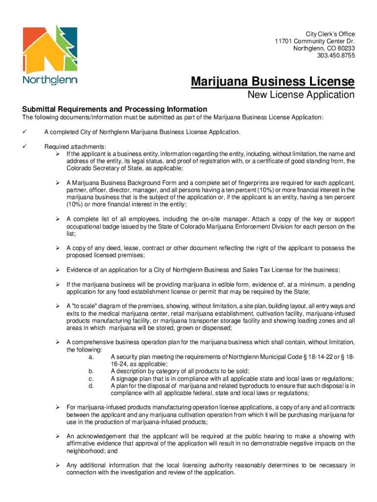 City Clerks Office 11701 Community Center Dr. Northglenn, CO 80233 303.450.8755Marijuana Business License New License Application Submittal Requirements and Processing Information The following documents/information