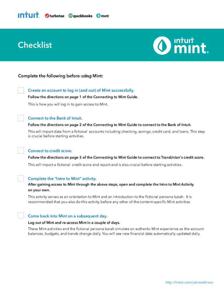 Intuit Education: Curriculum Orientation Checklist Connecting to Mint Intro to Mint ActivityChecklistComplete the following before using Mint: Create an account to log in (and out) of Mint successfully.