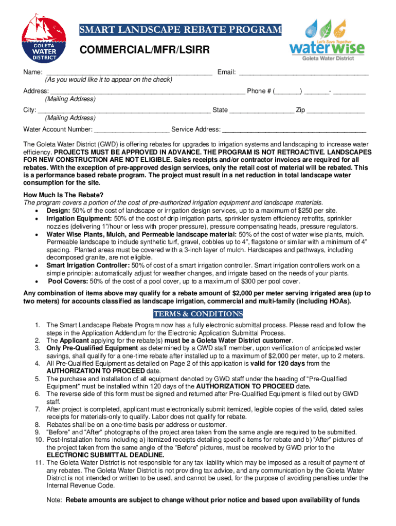 SMART LANDSCAPE REBATE PROGRAM COMMERCIAL/MFR/LS IRR Name: ___ Email: ___ (As you would like it to appear on the check) Address: ___ Phone # (___) ___ ___ (Mailing Address) City: ___ State ___ Zip