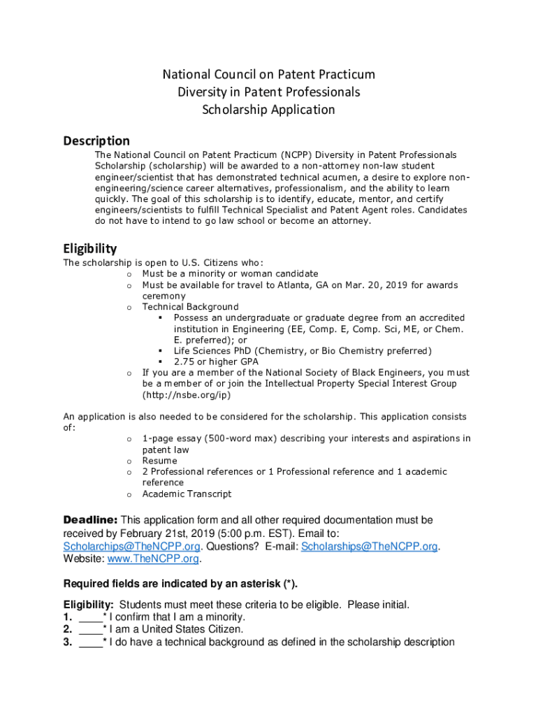 National Council on Patent Practicum Diversity in Patent Professionals Scholarship Application Description The National Council on Patent Practicum (NCDP) Diversity in Patent Professionals Scholarship