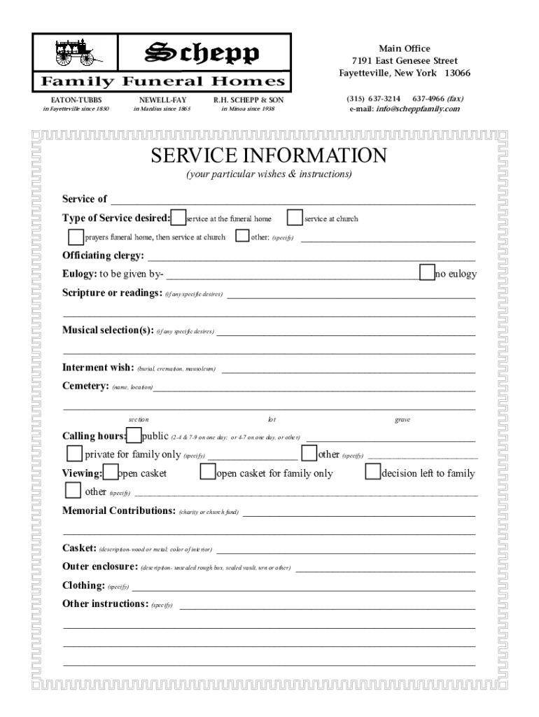 ScheppMain Office 7191 East Geneses Street Fayetteville, New York 13066Family Funeral Homes EATONTUBBSNEWELLFAYR. H. SCH EPP & Sonic Fayetteville since 1850in Marius since 1865in Minor since 1938(315)