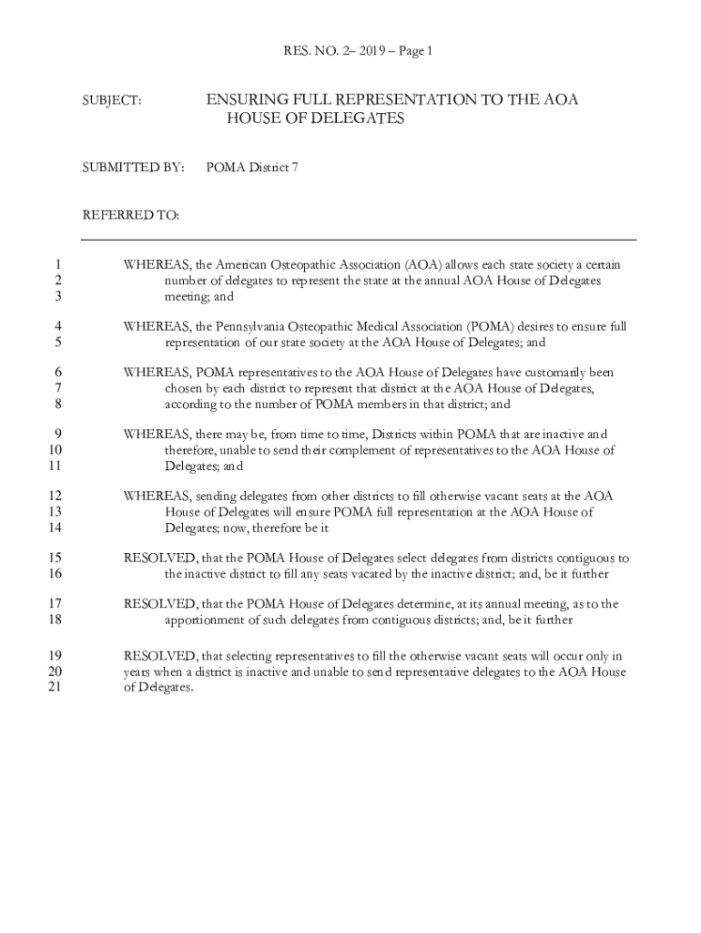 RES. NO. 2 2019-Page 1 SUBJECT:ENSURING FULL REPRESENTATION TO THE AOA HOUSE OF DELEGATESSUBMITTED BY:COMA District 7REFERRED TO:1 2 3WHEREAS, the American Osteopathic Association (AOA) allows each