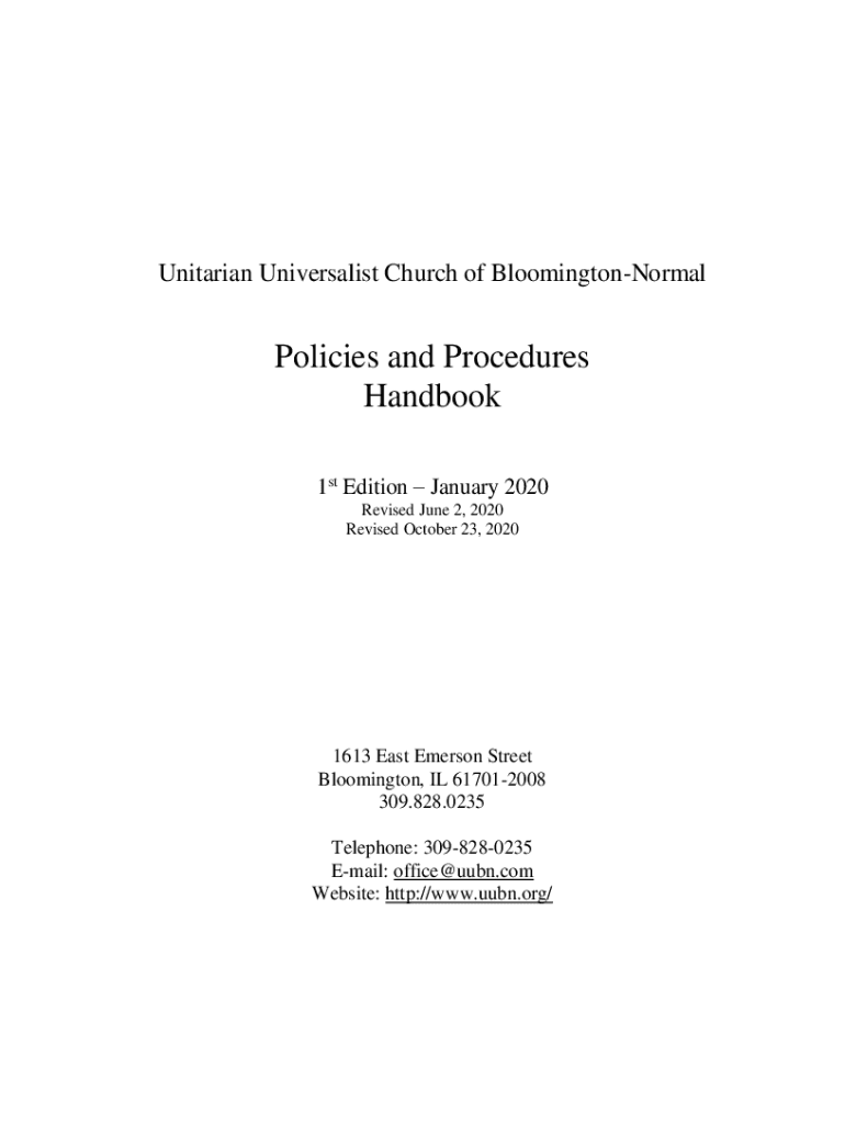 Unitarian Universalist Church of BloomingtonNormalPolicies and Procedures Handbook 1st Edition January 2020 Revised June 2, 2020, Revised October 23, 20201613 East Emerson Street Bloomington, IL 617012008