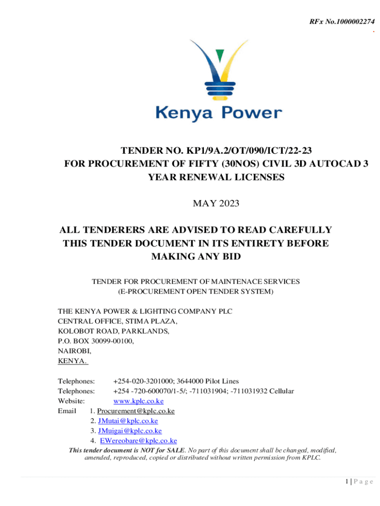 Rex No.1000002274.TENDER NO. KP1/9A.2/OT/090/ICT/2223 FOR PROCUREMENT OF FIFTY (30NOS) CIVIL 3D AutoCAD 3 YEAR RENEWAL LICENSES MAY 2023 ALL TENDERER ARE ADVISED TO READ CAREFULLY THIS TENDER DOCUMENT