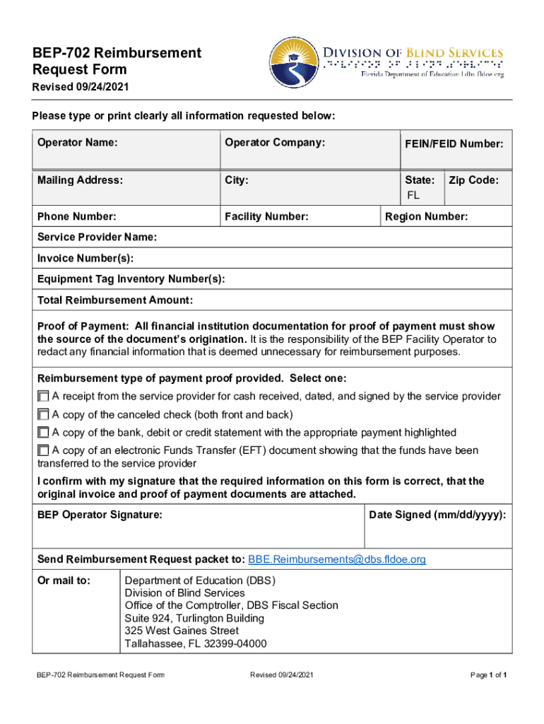 BEP702 Reimbursement Request Form Revised 09/24/2021 Please type or print clearly all information requested below: Operator Name:Operator Company:VEIN/FED Number:Mailing Address:City:State: FLP hone
