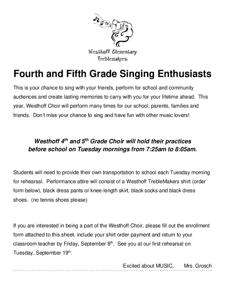 Fourth and Fifth Grade Singing Enthusiasts This is your chance to sing with your friends, perform for school and community audiences and create lasting memories to carry with you for your lifetime