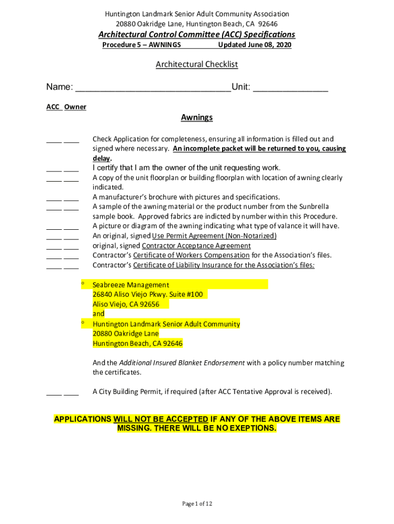 Huntington Landmark Senior Adult Community Association 20880 Oak ridge Lane, Huntington Beach, CA 92646Architectural Control Committee (ACC) Specifications Procedure 5 AWNINGSUpdated June 08, 2020Architectural