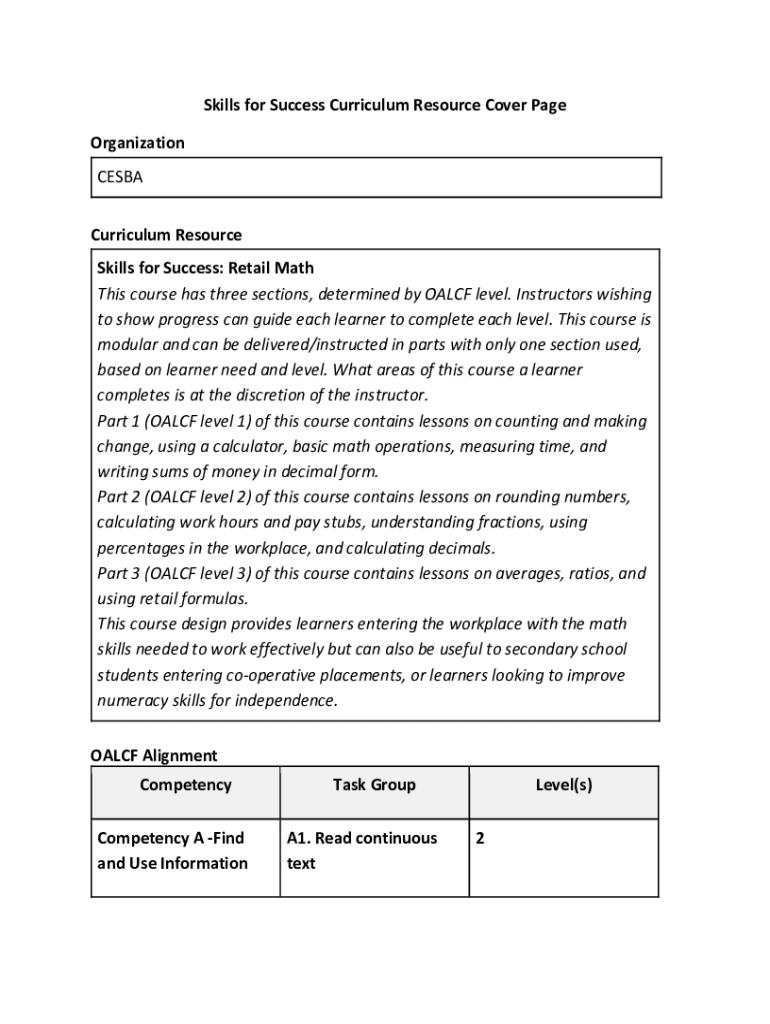 Skills for Success Curriculum Resource Cover Page Organization CE SBA Curriculum Resource Skills for Success: Retail Math This course has three sections, determined by OAL CF level. Instructors wishing
