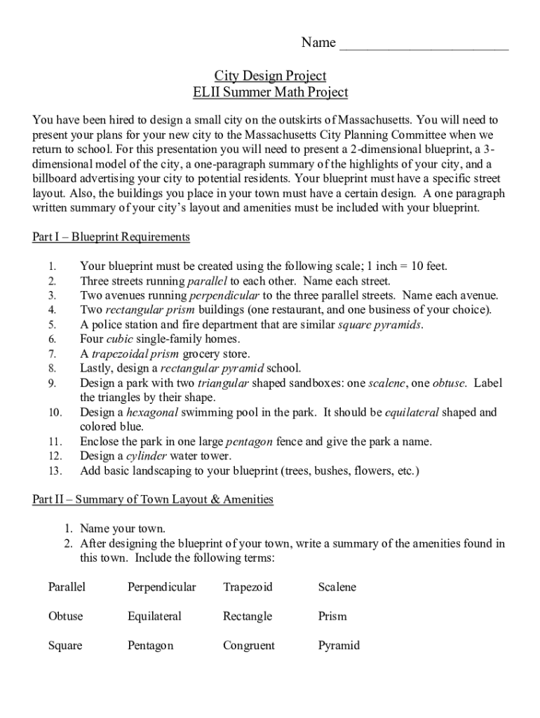 Name ___ City Design Project ELI Summer Math Project You have been hired to design a small city on the outskirts of Massachusetts. You will need to present your plans for your new city to the Massachusetts