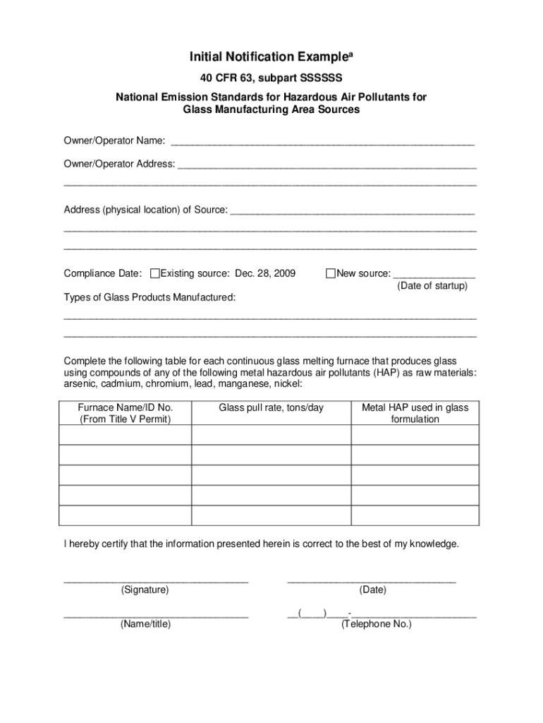 Initial Notification Example 40 CFR 63, subpart SSS National Emission Standards for Hazardous Air Pollutants for Glass Manufacturing Area Sources Owner/Operator Name: ___ Owner/Operator Address: ___