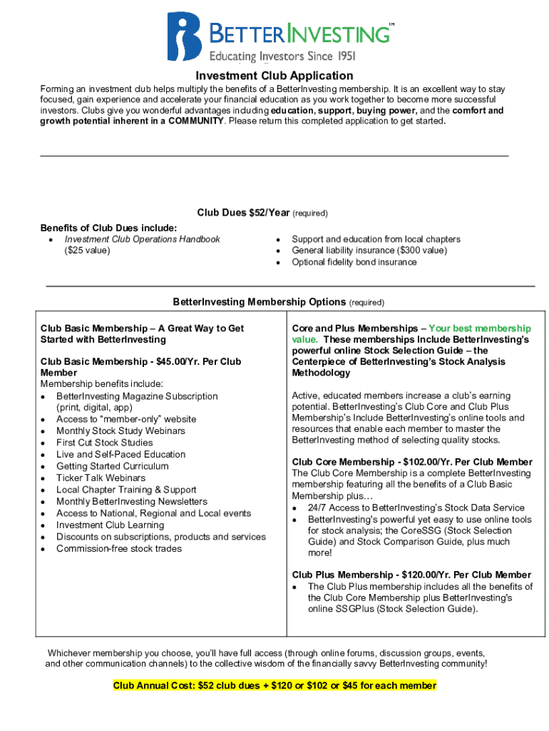 Investment Club Application Forming an investment club helps multiply the benefits of a BetterInvesting membership. It is an excellent way to stay focused, gain experience and accelerate your financial