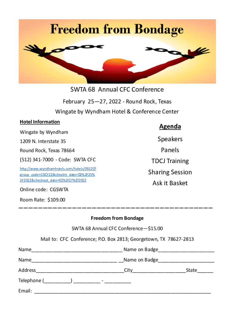Freedom from BondageSWTA 68 Annual CFC Conference February 2527, 2022 Round Rock, Texas Win gate by Wyndham Hotel & Conference Center Hotel InformationAgendaWingate by WyndhamSpeakers1209 N. Interstate